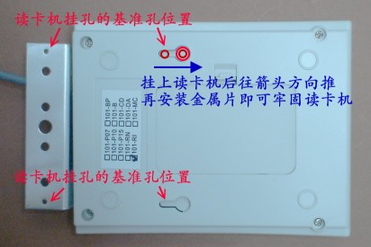 用笔在两个标有“1”的孔内做上记号,这两个基准孔对应读卡机的挂孔位置,然后凿孔上适当的螺丝,挂上读卡机后,参照下一个图示,再安装金属固定片。