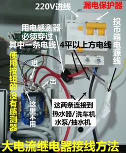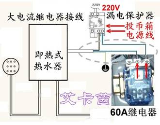投幣箱的三蕊電源線要跟熱水器/電器的漏電開關/空氣開關,接在一起
