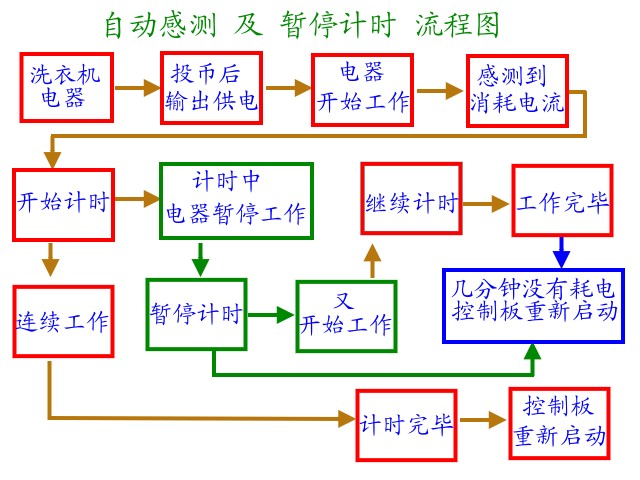 洗衣机使用说明: ◎每一台洗衣机都有洗衣流程可以选择,譬如:快洗,脱水,浸泡,加强洗….等等。 ◎我们的投币箱是不能控制洗衣机的流程的,而是在投币后,输出电源插座就会开始供电,使用者选择好洗衣机的洗衣流程,然后按下洗衣机的启动按钮后,主板会智能感测洗衣机是不是在工作(有没有耗电),进而判断是不是需要关闭投币箱内插座的电源,或继续供电。 |