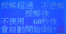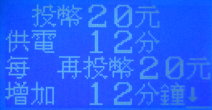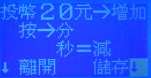 ←投幣金額超過,啟動時會退回上一個金額的時間 譬如(本頁面的收費) 投幣20元,啟動,執行10元20分鐘 投幣40元,執行30元42分鐘 |