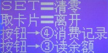 充值金额0元,按下(SET)按钮选择 1.按下(SET)按钮,清零,2.取卡离开 3.按下按钮(4),可以查看消费卡消费记录 4.按下按钮(3),可以查看消费卡余额 |