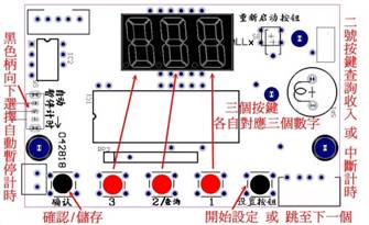 ◎按“設定按鈕”開始設定,按儲存後,不再修改其他的,可直接按重新開機按鈕 ◎測試計時(清除正在計時)的時候,時間要清零的話,長按查詢按鈕(按鈕2),有滴滴聲再放開按鈕,就會清零 |